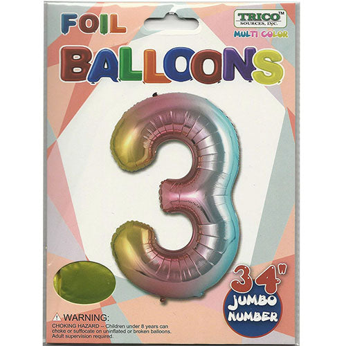 Quantity : 1 Balloon per package Size : 34 inch or 87 cm tall Material : Foil Brand : Conver USA Color : Rainbow UPC : 681070116930 Packaging : Conver Retail Poly Bag Type : HELIUM REQUIRED to inflate Character : Number 3 Purpose of use : All occasions