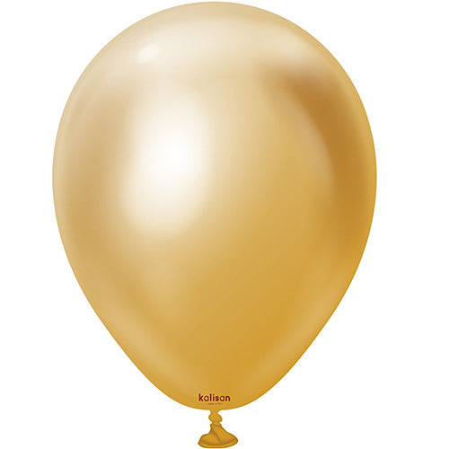 Quantity: 100 Balloons per package Dimensions: 5" or 14 cm Material: Natural latex Brand: Kalisan Balloons ( Colors of Life ) Color : Mirror Gold SKU : 10550011 EAN : 8693296001114 Packaging : Kalisan Retail Poly Bag Color Type : Gold Chromed look